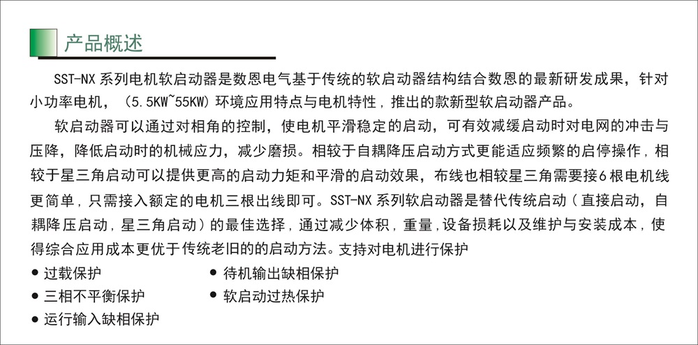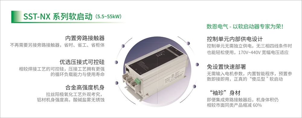 SST系列内置旁路式电机软启动,集成旁路接触器于一体,较大的缩减了应用时的施工成本。合金高强度机身,控制单元内部供电设计,免设置快速部署,小巧精悍!