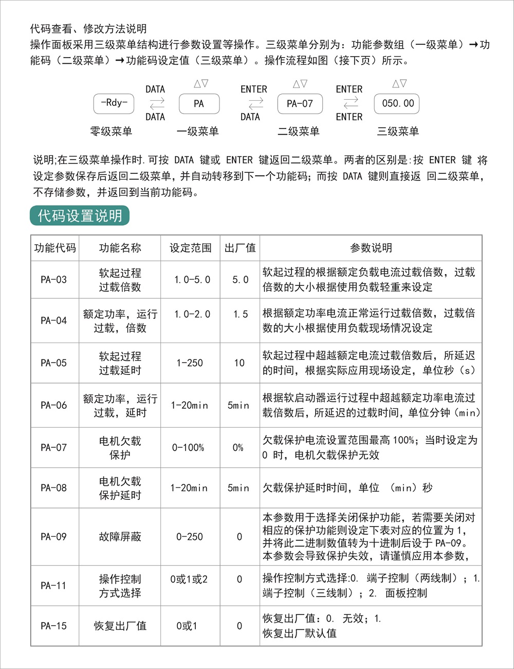 ⾯板上具备可整定的调节旋钮,基于电压斜坡启动模式,直 观的设定电压斜坡的软启动时间,启始电压与软停⽌时间,简单 易⽤。