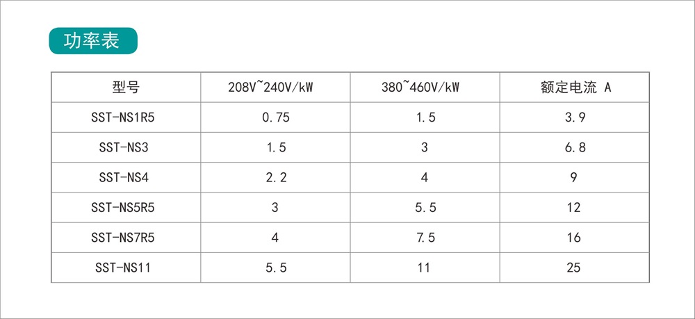 SST-NS系列软启动器是来⾃于SST产品线中,针对⼩功率规 格范围开发的⼀款紧凑型内置旁路式软启动器。该系列覆盖功率 范围从1.5kW到11kW,兼容电压范围从208V~460V。本系列继承 了SST-NX系列的⼤部分优势特性,使⽤简单,内置开关电源,内 置运⾏旁路,可选配外接控制键盘。