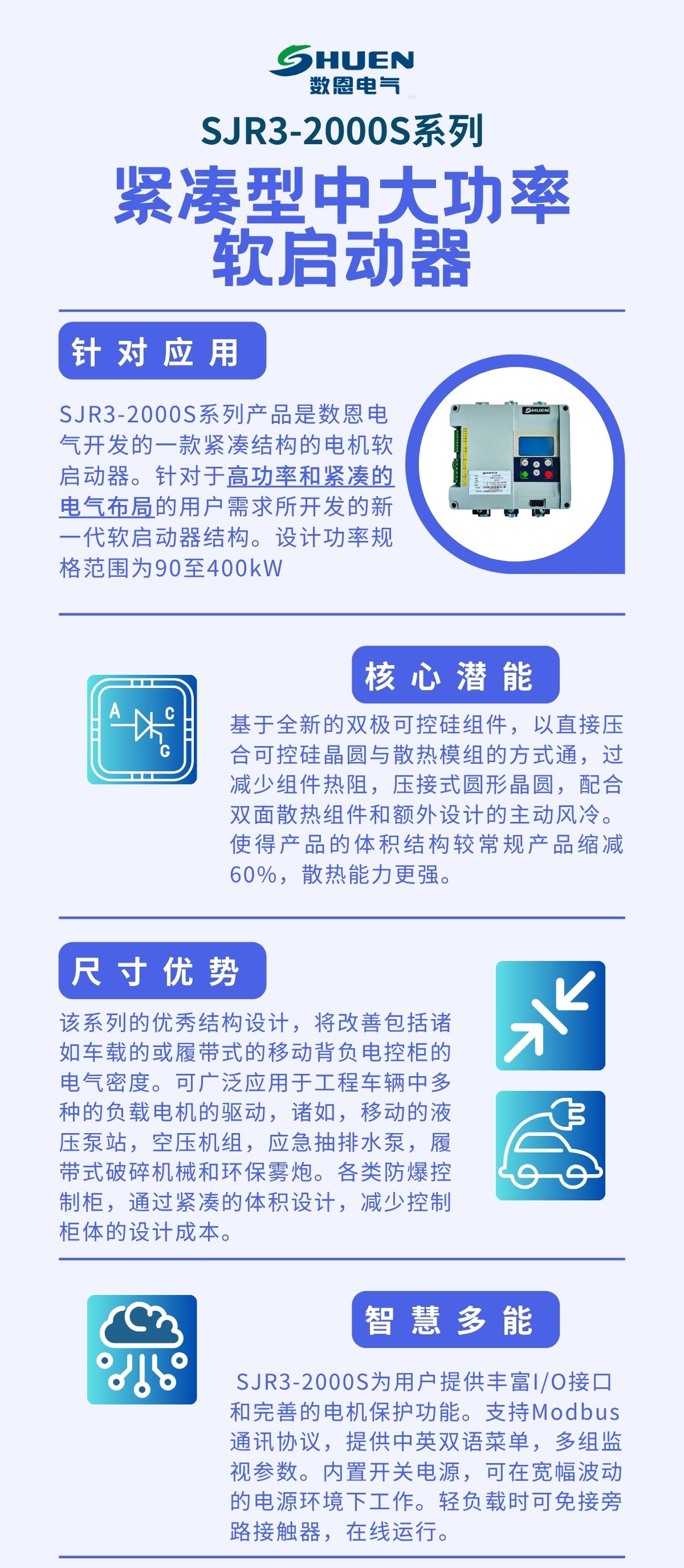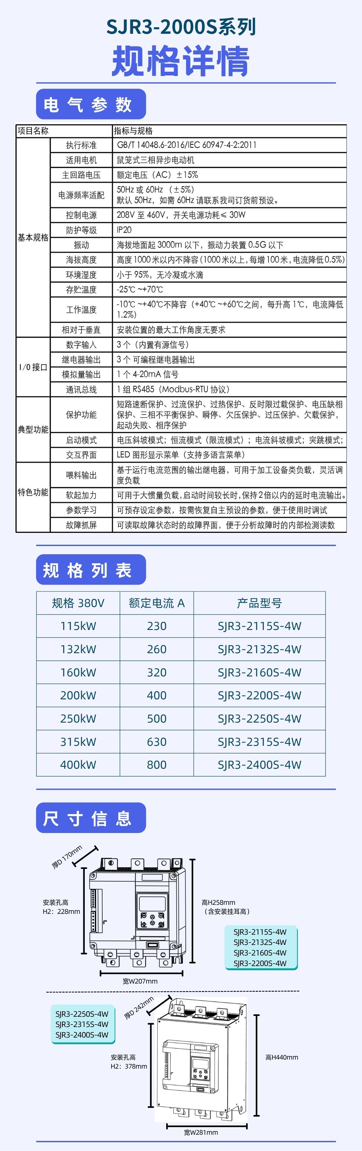 SJR3-2000S是710公海线路检测公司最新研发的超紧凑软启动器,针对紧凑的车载(履带式)电柜 / 防爆电箱 / 壁挂基业箱 提出高密度电气解决方案,兼容在线式应用的同时兼备有外置旁路连接方式,增加了欠载,运行次数,运行时间,线性的温度监控等多种功能,内置集成了RS485通讯总线,提供多语种菜单。